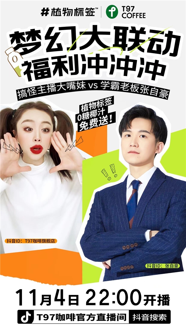 11月4日晚,本土植物奶品牌“植物标签”创始人、清华学霸男神张自豪空降T97直播间,和大嘴妹一起联动直播,并为粉丝送上多重惊喜福利,大嘴妹的超高人气加上学霸男神张自豪的自带流量,也使得当晚的T97直播间流量爆棚,同时在线人数达到10w+。