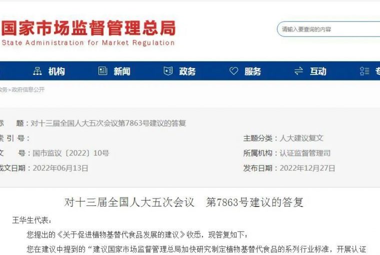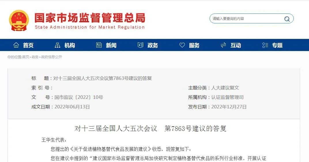 近日,国家市场监督管理总局发布《对十三届全国人大五次会议第7863号建议的答复》,就全国人大代表王华生提出的《关于促进植物基替代食品发展的建议》高度赞赏,并表示:将更加积极地发挥市场监管职能作用,推动植物基替代食品行业健康发展。