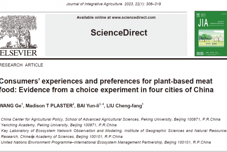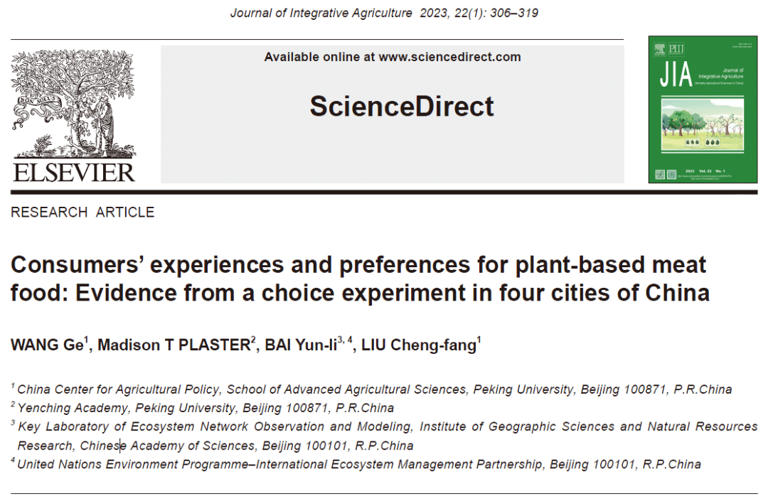 近期,北京大学现代农学院刘承芳课题组在Journal of Integrative Agriculture (《农业科学学报》(英文),JIA) 2023年1期正式发表了题为“Consumers’ experiences and preferences for plant-based meat food: Evidence from a choice experiment in four cities of China”的研究,探讨了中国消费者的植物肉消费经历与偏好。
