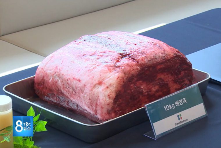 TissenBioFarm 在位于庆尚北道的韩国细胞农业支持中心开幕式上首次展示了一块巨大的培养肉。