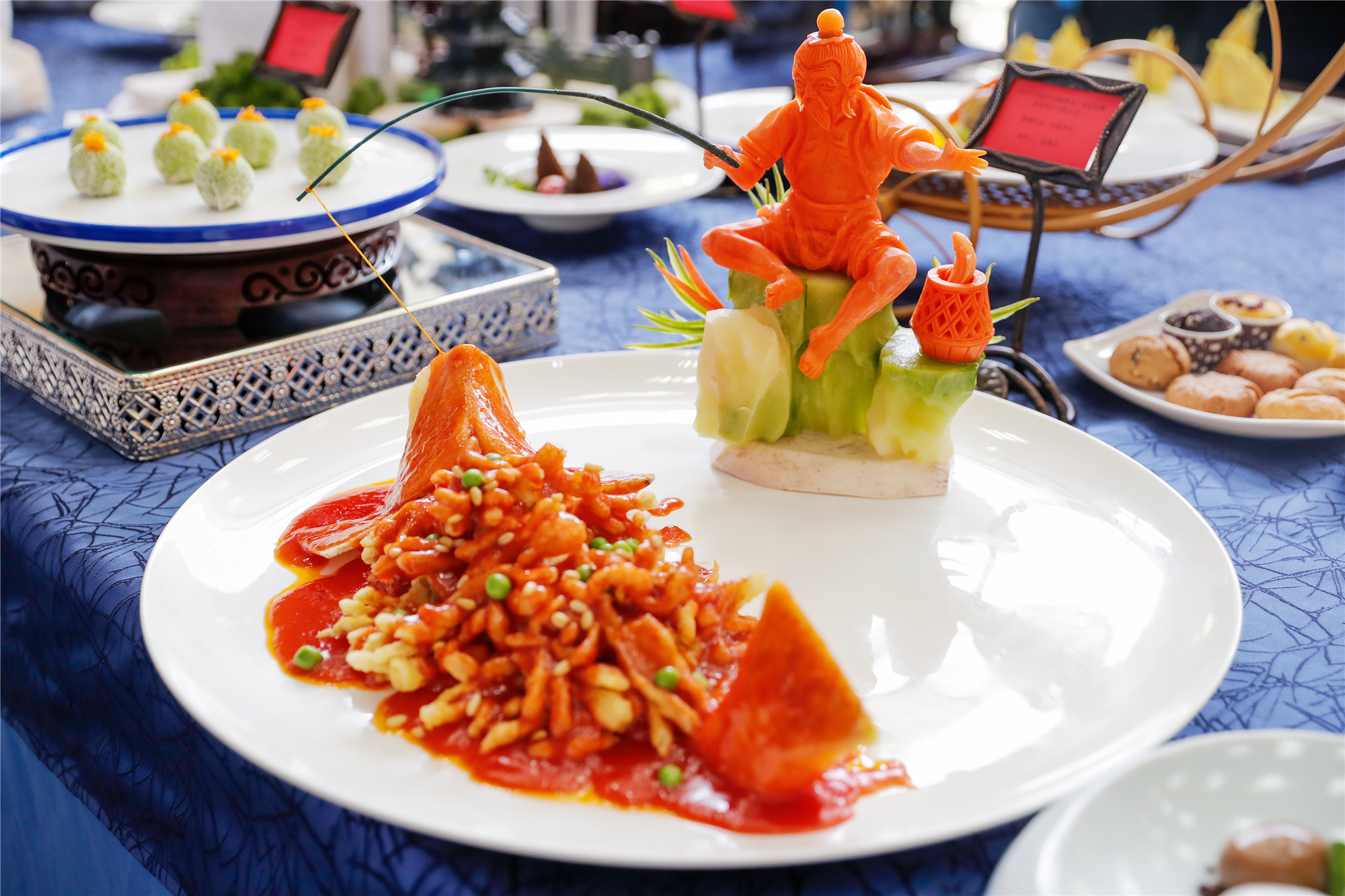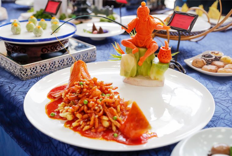 4月16日,在武汉商学院食品科技学院实训室,来自全国各地的厨艺大师汇聚一堂,揉面、捏花、雕刻、油炸、浇汁动作一气呵成,精雕细琢后一件件作品被摆上展台。一道“富贵有余”,看上去似乎是普通的松鼠鳜鱼,入口后才发现是冰榔芋头和杏鲍菇的结合体,冰榔芋头雕刻的鱼头和鱼尾,鱼身则是用杏鲍菇切成菊花刀开水烫透捞出,放入生粉和玉米粉油炸制成。另一道“罗汉素养”,远望去是一根海参,实际上是用羊肚菌和莲藕制成,羊肚菌泡发后,莲藕搓泥,辅之以花菇切末,加盐和蘑菇粉调味,煎定型,再加入调味后制成。一道道看似精美的荤菜,原料主要以豆制品类、菌菇类、大豆蛋白类、坚果类、蔬菜类为主,通过素食的口味展现出更为丰富的食物形态。
