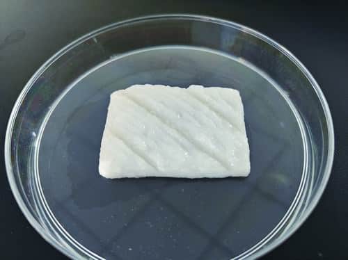 该项研究中,科研人员以大黄鱼为研究对象,分离出具有高传代能力的肌肉、脂肪干细胞,并通过调控两种信号通路诱导肌肉干细胞分化;基于可食用凝胶改造仿生建构鱼肌支架,产生类似自然鱼肉该有的结构和纹路,令肌肉细胞沿着3D打印的仿生结构有规则地生长,形成三维培养肌纤维束,实现组织状细胞培养鱼肉的制造。