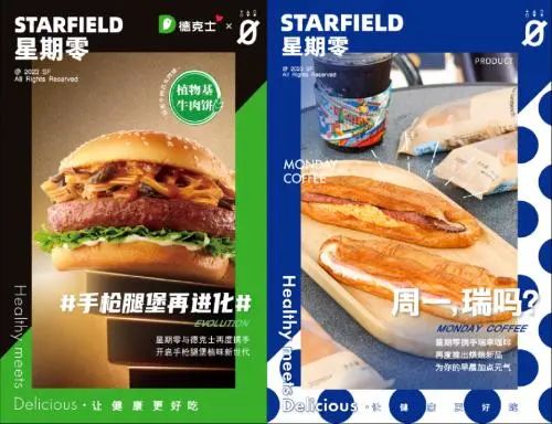 这不是德克士、瑞幸与「星期零」的第一次合作。2020年,「星期零」首次携手德克士推出植物肉汉堡绿仙仙植物鸡肉堡,并在德克士全国2600家门店上线,上市5天就卖出了超过10万份。2021年,「星期零」联合瑞幸咖啡推出健康植场套餐,发布了青柠植物火腿贝果和蛋香植物火腿三明治,在微博、朋友圈等社交渠道引起广泛关注。