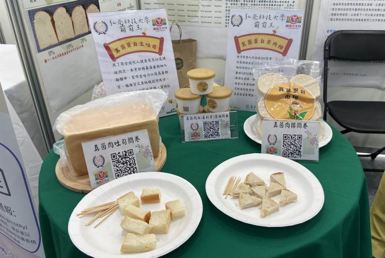 弘光科大研发团队用真菌蛋白做出的生吐司、素肉、冰淇淋等产品。(陈淑娥摄)