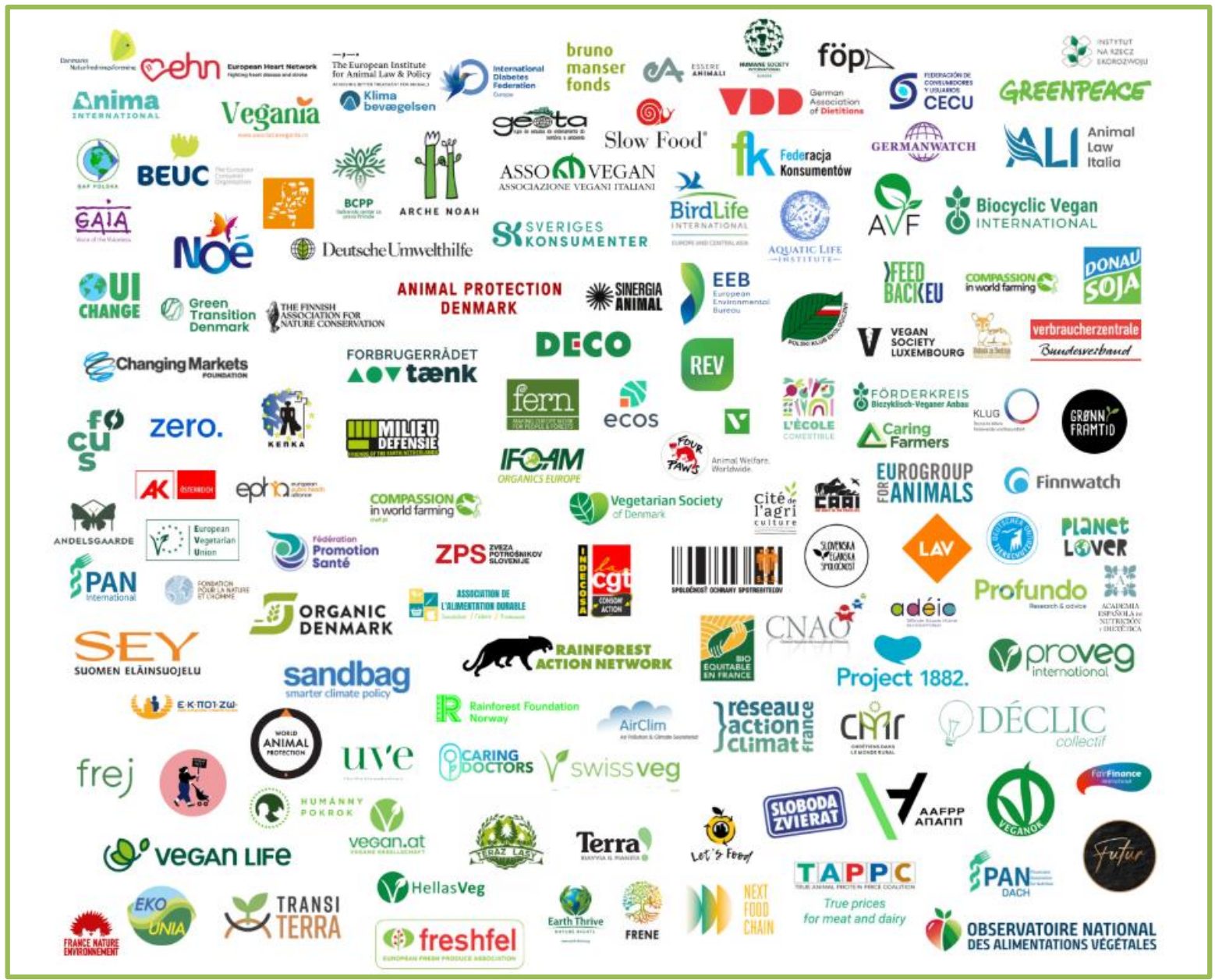 这些组织代表了众多群体,包括农民、卫生专业人员、消费者、动物福利和环境爱好者。其中包括 BEUC、ProVeg International、绿色和平组织、IFOAM、雨林行动网络、世界农场主协会和 Freshfel。
