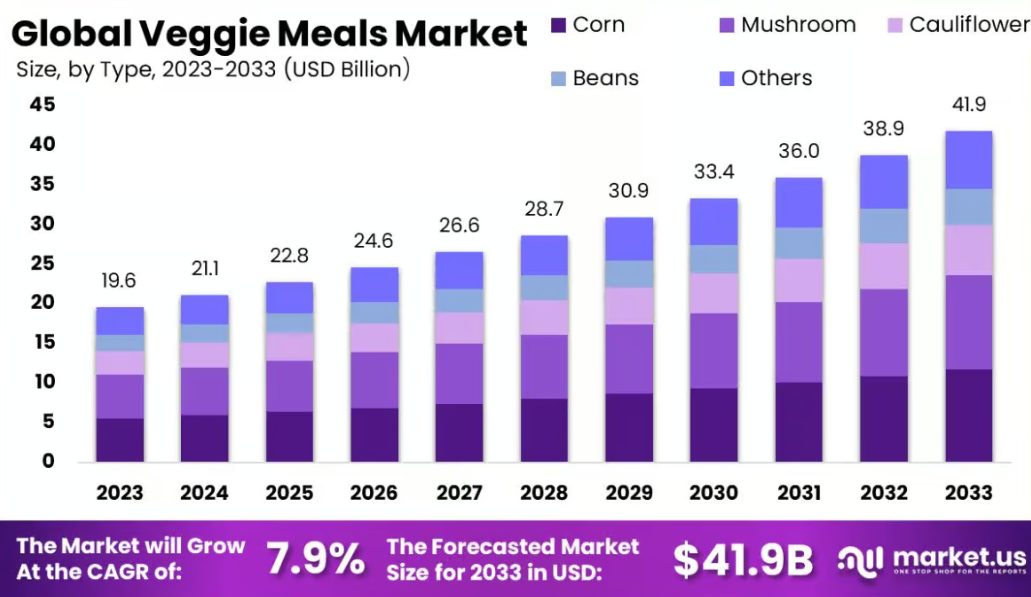 全球植物性方便餐食市场正在经历显著增长,预计将从2023年的196亿美元扩大到2033年的419亿美元,年复合增长率(CAGR)为7.9%。这一增长得益于消费者对更健康、更可持续食品选择的偏好增加,反映出向植物性饮食的重大转变。