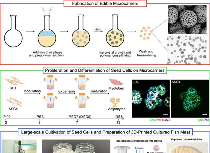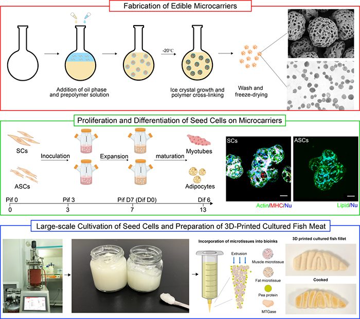 随着全球人口增长和资源环境压力的加剧,细胞农业作为可持续的食品生产方式逐渐成为食品领域的研究热点。细胞农业通过细胞培育技术生产肉类,能够减少传统畜牧业和渔业对环境的影响,提高食品安全性和动物福利。然而,如何实现细胞的大规模扩增和对天然肉类特征的精确模拟是细胞培育鱼肉产业化面临的关键挑战之一。当前,传统养殖渔业对海洋资源消耗大,而实验室培育的“人造肉”又面临细胞难以大规模高效培养、口感差的难题。针对这一问题,中国海洋大学食品科学与工程学院薛长湖院士团队进行研究,相关成果以“Scalable production of muscle and adipose cell-laden microtissues using edible macroporous microcarriers for 3D printing of cultured fish fillets”(利用可食性多孔微载体大规模生产肌肉和脂肪细胞微组织,用于3D打印培育鱼肉)为题发表在国际知名期刊Nature Communications(《自然-通讯》)。薛长湖院士和郑洪伟副教授为该论文共同通讯作者,该研究得到了国家重点研发计划、山东省重点研发计划等项目的支持。可食性微载体构建、种子细胞程序化培养与3D打印培育鱼肉开发流程研究内容:通俗来说,就是创造性开发了基于可食性大孔微载体(EPMs)的细胞培养技术(见上图),这种微载体类似一种可食用、多孔的“细胞小房子”,让鱼肉的肌肉细胞(大黄鱼肌卫星细胞(SCs))和脂肪细胞(脂肪干细胞(ASCs))能在里面快速繁殖,可以大幅度提高细胞的数量和质量;最后用3D打印技术把这些含有细胞的微组织根据一定的程序制作成一块块可食用的鱼肉。技术核心及具体操作: