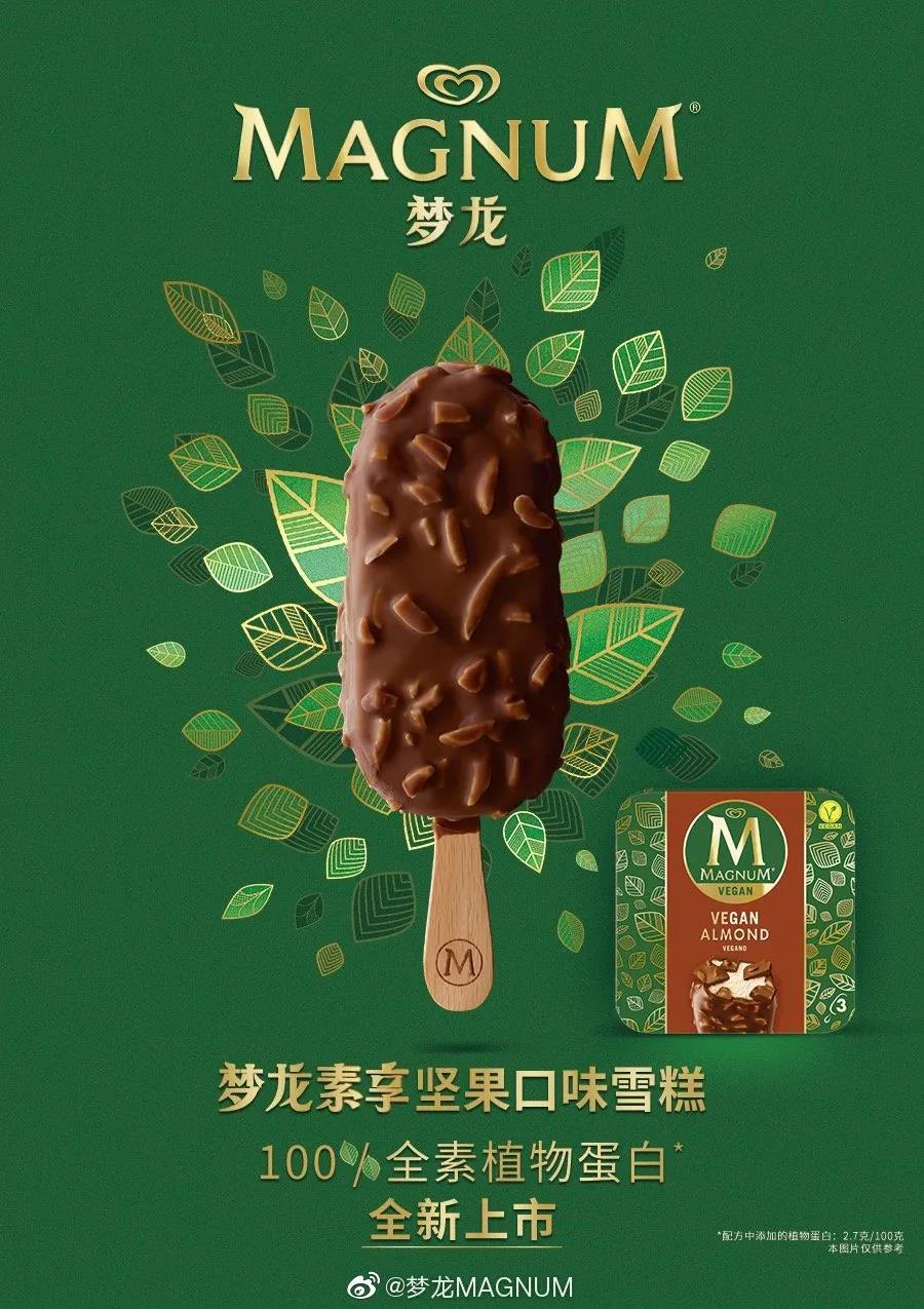 梦龙素享坚果口味雪糕,100%全素植物蛋白,0乳糖0动物脂肪,相比动物蛋白,可以减少98%土地使用,87%用水量,89%温室气体。