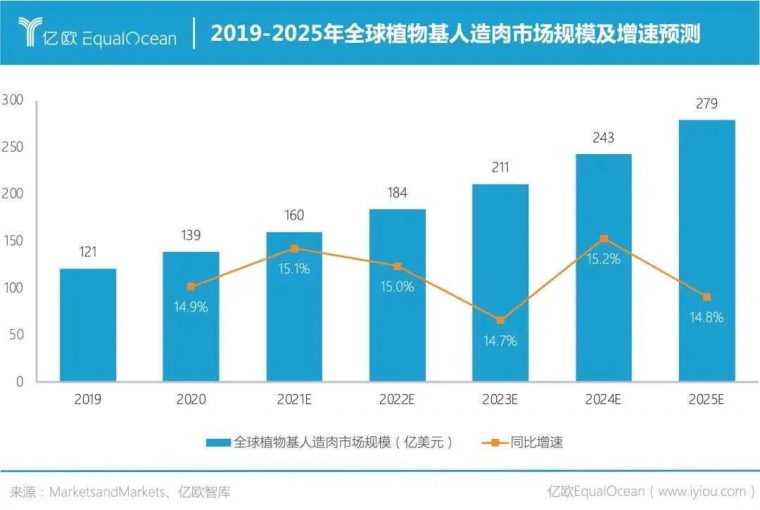 根据全球知名市场研究咨询公司MarketsandMarkets,2020年全球植物肉市场规模约139亿美元,并预计以每年约15%的复合增长率增长,到2025年或将达279亿美元(约合1790亿元人民币)。