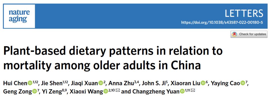 2022年3月7日,浙江大学公共卫生学院袁长征研究员课题组与公共管理学院中国农村发展研究院汪笑溪研究员课题组合作,在 Nature Aging 期刊发表了题为:Plant-based dietary patterns in relation to mortality among older adults in China 的研究论文。该研究基于中国纵向健康长寿调查(CLHLS),报道了老年人群中植物性饮食模式与死亡的前瞻性关联。