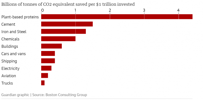 根据世界上最大的咨询公司之一,植物肉类替代品投资所带来的气候变暖排放量削减远远大于其他绿色投资。波士顿咨询公司(BCG)的报告发现,与绿色水泥技术的投资相比,改进和扩大肉类和乳制品替代品生产投资所带来的温室气体减排量是其三倍,是绿色建筑的七倍,是零排放汽车的十一倍。